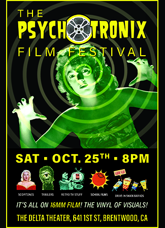 Every show is different, so join us for a unique presentation of the Psychotronix Film Festival: Monster movie trailers, vintage TV commercials, out-of-this-world cartoons, Scopitones, drive-in snack bar ads, weird retro short subjects, and things you won't see anywhere else! And it's all on glorious 16mm Film!