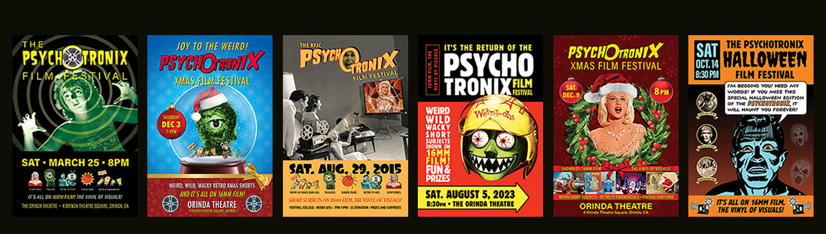 The Psychotronix Film Festival started at Foothill College in 1992 as a fundraiser for the campus radio station, KFJC. We show only 16mm films, the vinyl of visuals, an archaic medium that brings us wondrous images of a near forgotten time. Antiquated commercials, neglected cartoons, previews from old movies, various short subjects which may have been intentionally educational then that are now just unintentionally funny. We still do two shows a year at Foothill College, as well as four shows every year at the Orinda Theatre.